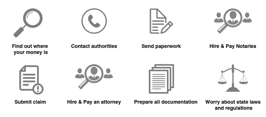 We will contact the authorities, we’ll find where your money is, we will prepare the paperwork and submit it for you, we will (if necessary) hire an attorney for you, prepare the legal documents, and send them to the county and other involved entities… and most importantly, we will get you your money back…